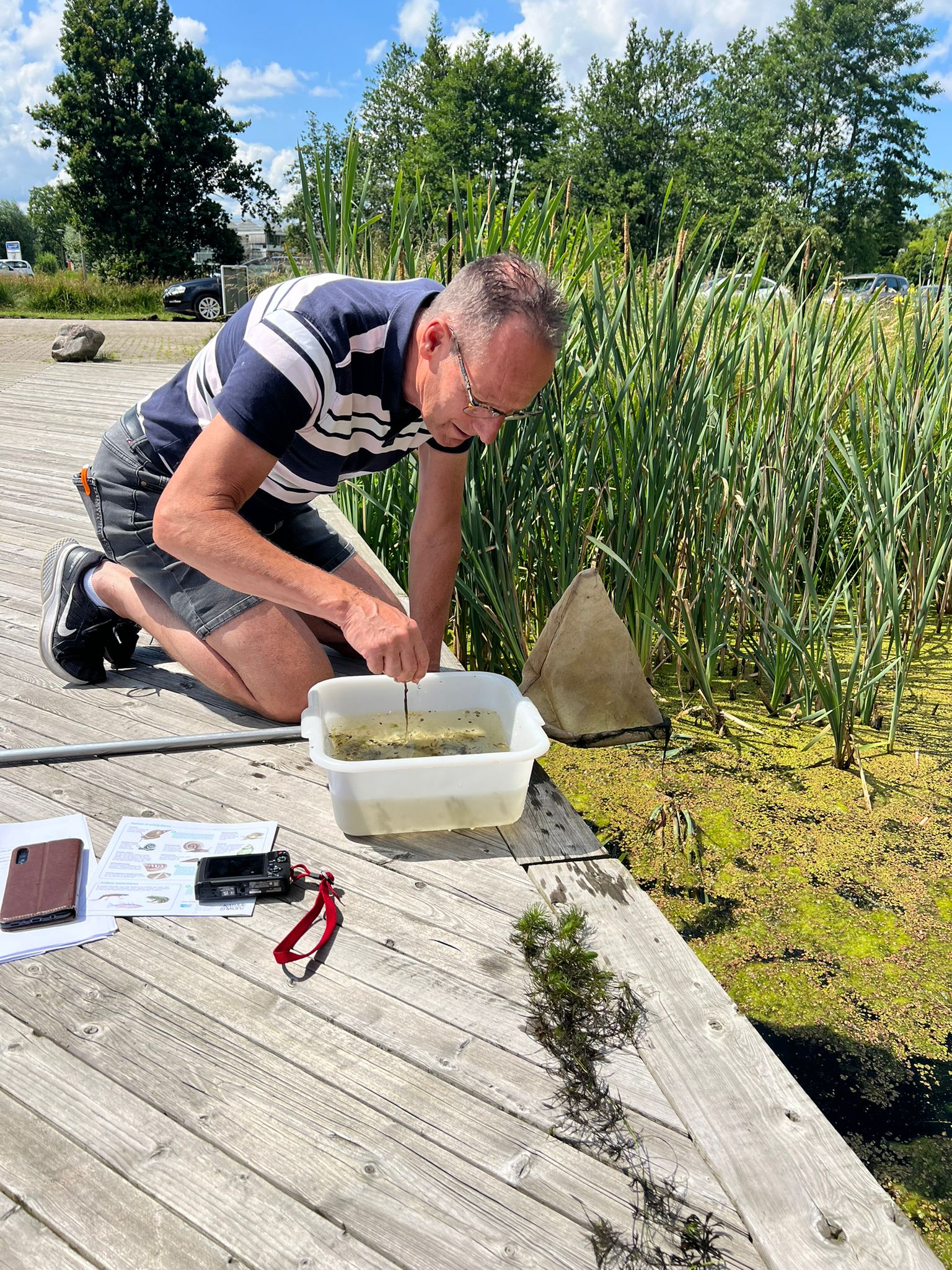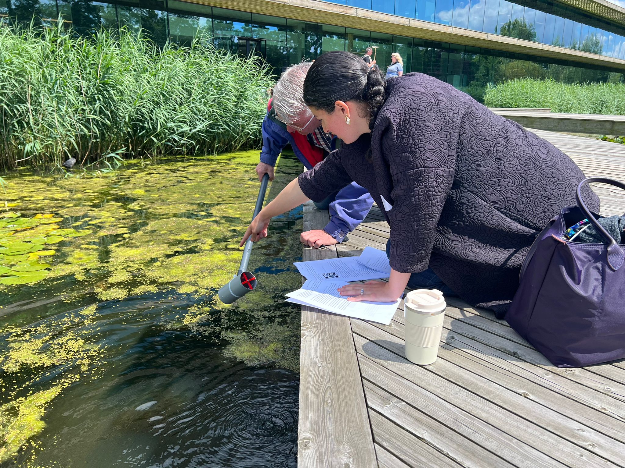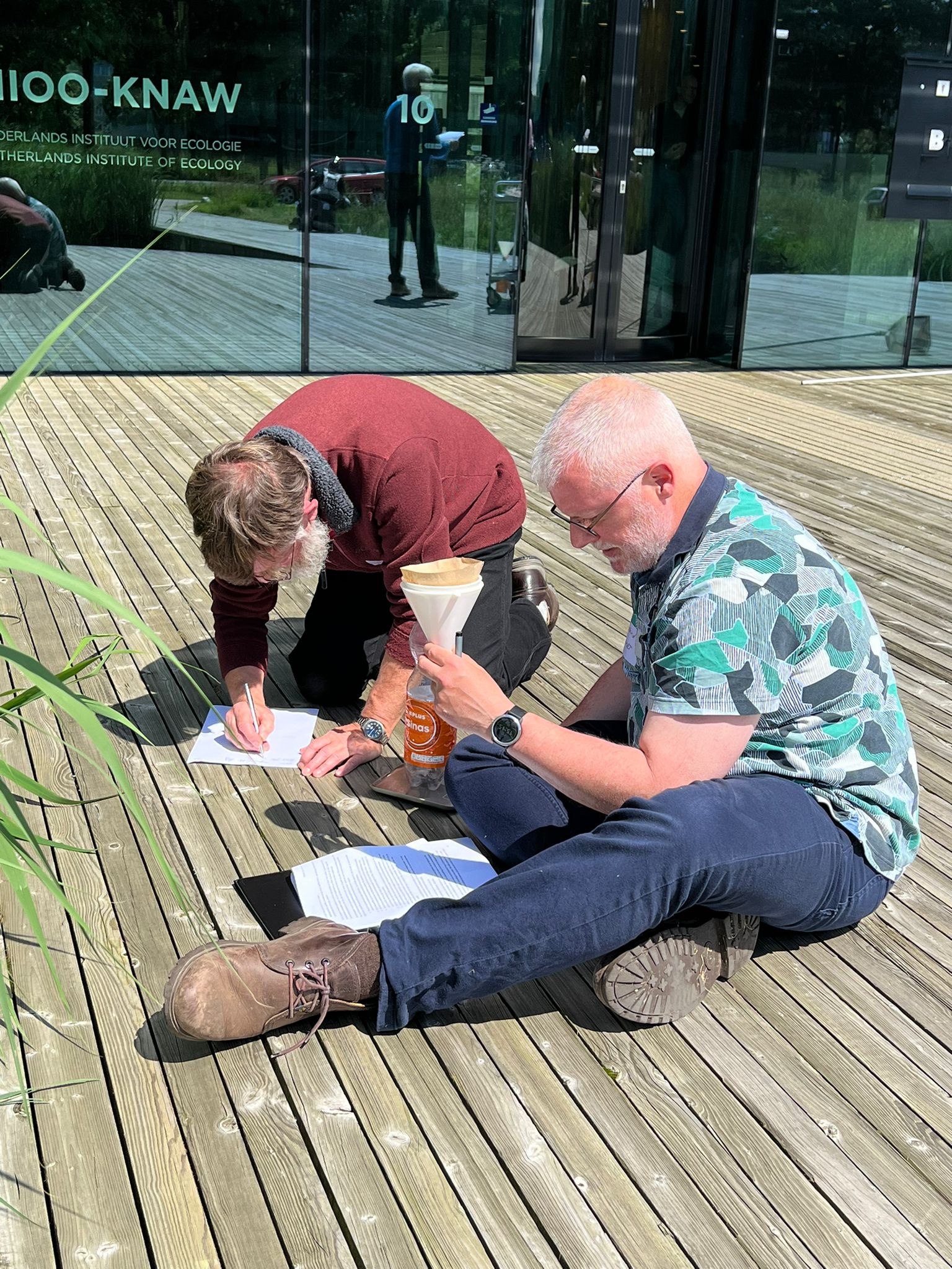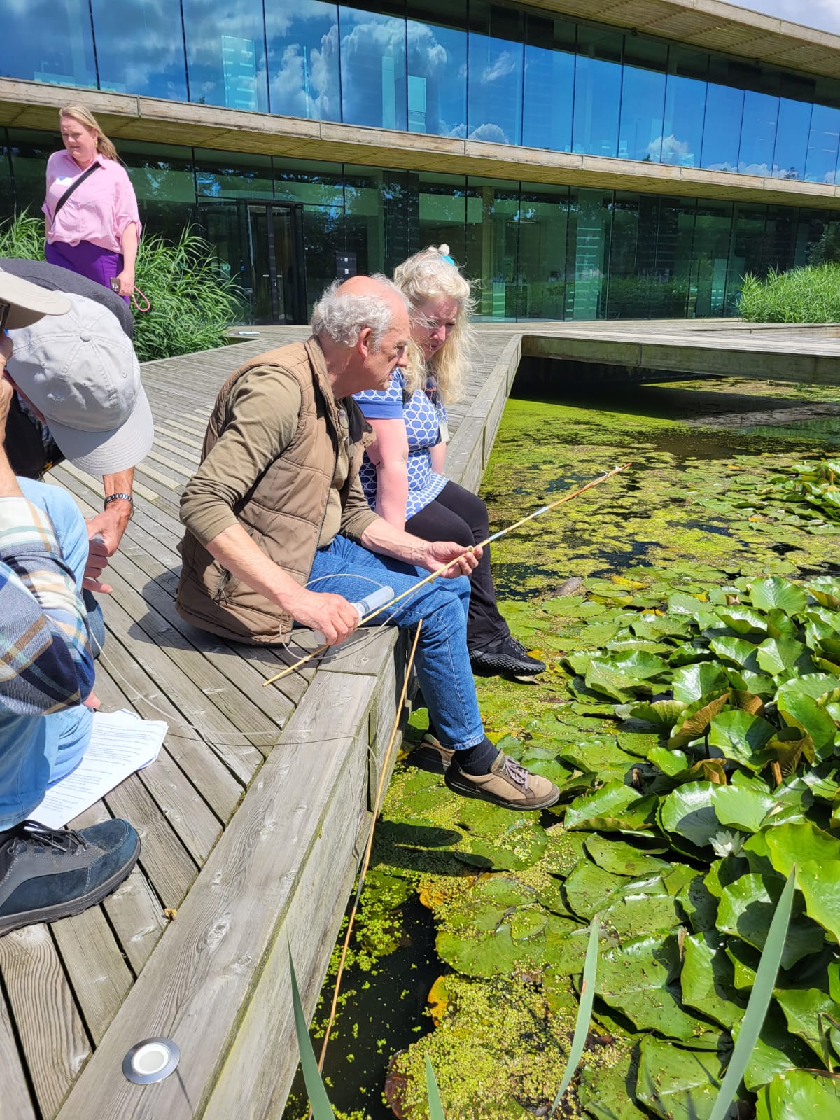 Tijdens deze co-creatie sessie testen de burgerwetenschappers meetmethodes op de brug voor het NIOO-KNAW gebouw en hebben we ook het protocol en online meetformulier doorgenomen om te kijken of dat gebruiksvriendelijk is. We testen de metingen voor het poriewater, de low tech stromingsmeter, de filteropstelling en de herkenning van waterdieren.